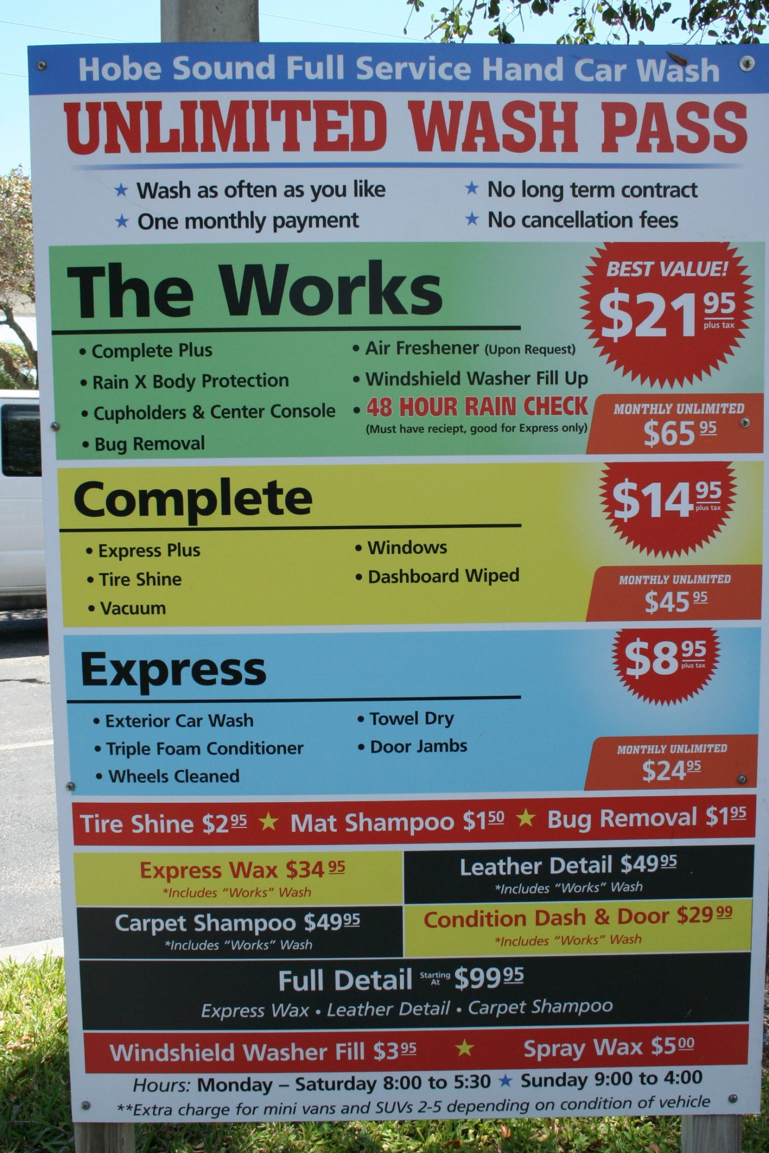 It was a slow day there yet took me almost 30 minutes to get my car done. Vipfull service car washvinyl cleaned & dressedtriple foamclear coatunderbody washwheel brightenertire shinefragrancerain x#1 beach rd$30.99#2 bridge rdfull service car washvinyl cleanedtriple foamclear coatunderbody washwheel brightenertire shinefragrance$25.99#3 federal hwy /us1full service car washclear coatunderbody. Don't be fooled by the cheaper prices.